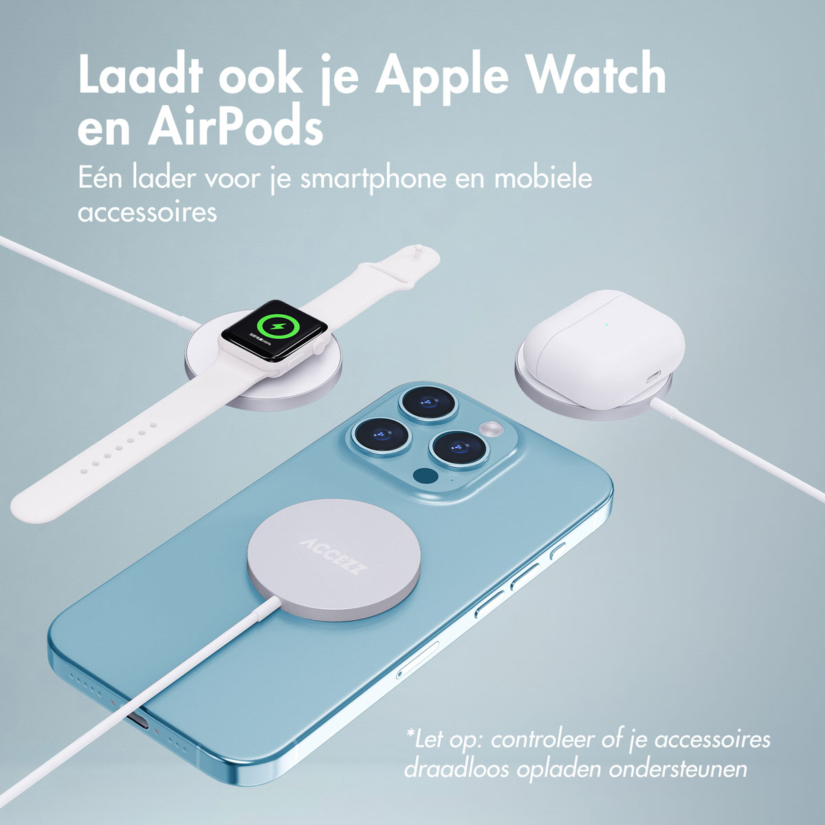 De Accezz Wireless MagSafe Charger is speciaal ontworpen voor je mobiele apparaten die werken met MagSafe en ondersteunen draadloos opladen van iPhones, AirPods en Apple Watches. De lader is universeel aan te sluiten op USB-C poorten, maar werkt optimaal met een Wall Charger van 18 Watt of meer. Magnetisch De sterke, ingebouwde magneten lijnen perfect uit op je MagSafe-compatibele iPhone, wat zorgt voor een stabiele en snelle oplaadervaring. Gebruik je een hoesje? Geen probleem, maar zorg er wel voor deze ook MagSafe heeft ingebouwd. Let op: om gebruik te maken van de draadloze oplader moet je telefoon compatibel zijn met MagSafe. Multifunctioneel gebruik Met de Accezz Wireless MagSafe charger heb je nog maar één lader nodig voor je Apple accessoires. Laad je iPhone, Apple Watch én AirPods draadloos op, zonder gedoe met meerdere kabels: ideaal voor onderweg of thuis. De kabel is ook te gebruiken met USB-C poorten op laptops, computers of powerbanks maar werkt optimaal met een 18 Watt USB-C adapter (deze is niet meegeleverd). Licht en sterk De Accezz Wireless MagSafe Charger is gemaakt van stevig aluminium, wat zorgt voor een sterke en lichtgewicht behuizing. De meegeleverde kabel is gemaakt van TPU/PVC, wat garant staat voor flexibiliteit en slijtvastheid, zodat je van de kabel gebruik kunt maken. En het ziet er ook nog eens strak uit. Accezz Sinds 2016 is Accezz één van onze eigen merken. Wij proberen op deze manier de klant tegemoet te komen in hun accessoire-wensen in de breedste zin, of het nu gaat om een telefoonhoesje, kabel, laptop sleeve of koptelefoon. Het assortiment sluit aan bij de wens naar een functioneel product dat gewoon goed is. Niet teveel poespas maar kwaliteit, om lang mee door te kunnen. Waarom de Accezz Wireless MagSafe Charger USB-C? * Geschikt voor apparaten die MagSafe ondersteunen * Geschikt voor accessoires die MagSafe ondersteunen * Magnetische uitlijning van de lader op je apparaat * Output telefoon: 15 Watt (max) * Output Apple Watch: 2,5 Watt * Output AirPods: 3 Watt * Universeel geschikt voor USB-C oplaadpunten (18 Watt of meer aanbevolen) * Gewicht: 43 gram * Behuizing gemaakt van aluminium, TPU en PVC * Een Accezz product * Met 1 jaar garantie Een oplaadstation in de vorm van één kabel. De magnetische Accezz Wirless MagSafe charger met USB-C kabel, ideaal voor dagelijks gebruik en reizen!