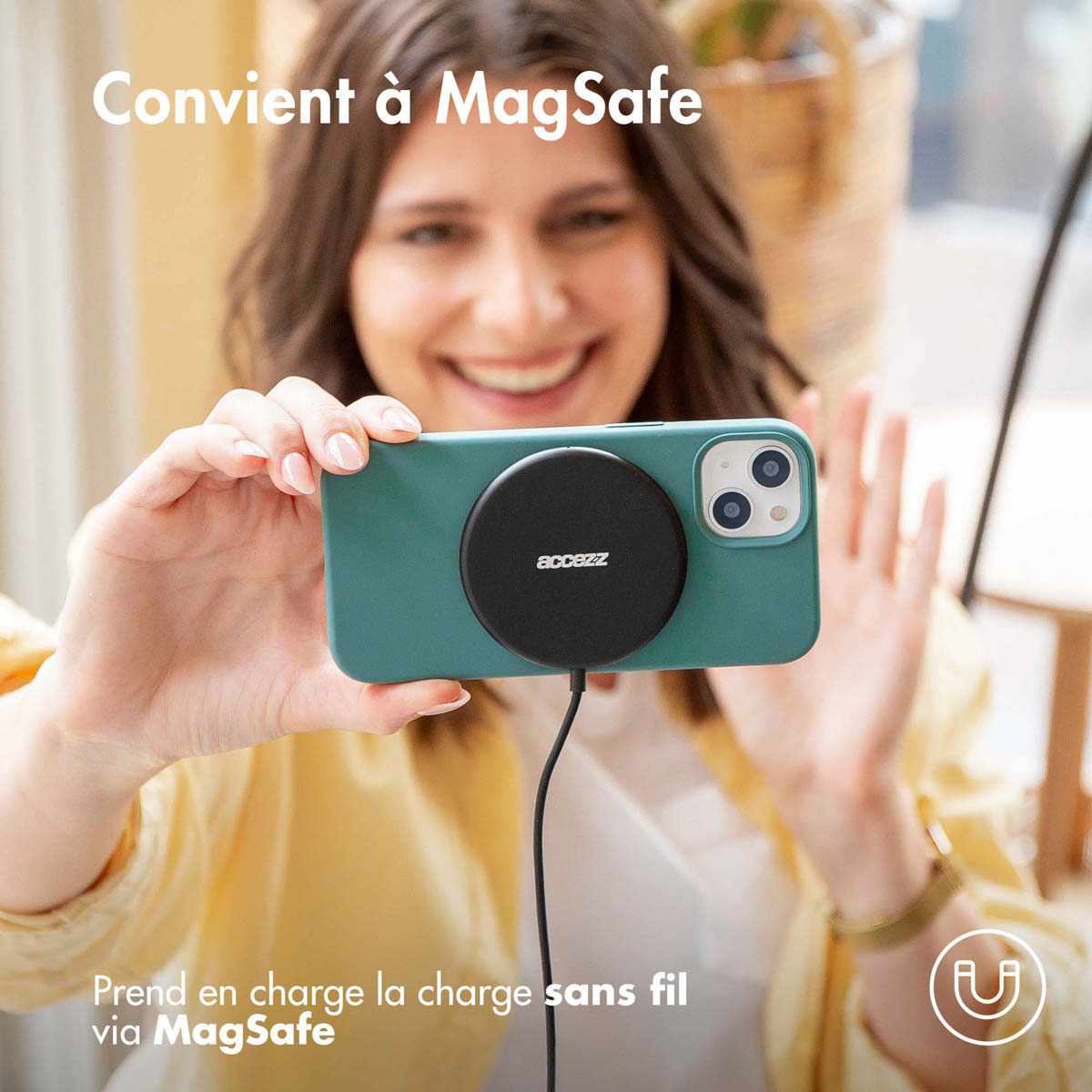Geef jouw smartphone een strakke én verzorgde look! De Accezz Liquid Silicone Backcover met MagSafe is gemaakt van speciaal gegoten siliconen materiaal en heeft een schokabsorberende werking. Daarnaast voorkomt de microfiber voering krassen op de achterkant jouw toestel. Dankzij de ingebouwde MagSafe functie, maak je gemakkelijk gebruik van MagSafe producten. Zodra het tijd is om jouw telefoon op te laden, kun je het hoesje gewoon om het toestel laten zitten en je MagSafe-oplader op je telefoon klikken. Daarnaast zit het hoesje mooi aangesloten om jouw telefoon. Dankzij het luxe en slanke ontwerp behoudt jouw toestel zijn design. Geschikt voor MagSafe MagSafe is een techniek waarmee accessoires magnetisch aan je telefoon gekoppeld worden. Dit product ondersteunt MagSafe technologie. Dat betekent dat MagSafe producten altijd precies goed op jouw smartphone klikken. Op deze manier maak je op een optimale manier gebruik van een MagSafe draadloze oplader en klikt een MagSafe kaarthouder altijd op de perfecte plek op je telefoon. Ook kun je gebruik maken van een MagSafe powerbank of MagSafe telefoonhouder. Stijlvol design De Accezz Liquid Silicone Backcover met MagSafe is vervaardigd van stevig siliconen materiaal en heeft een schokabsorberende werking. Daarnaast voorkomt de microfiber voering krassen op jouw toestel. Dit hoesje klik je gemakkelijk vast en zit mooi aangesloten om jouw telefoon. Dankzij het luxe en slanke ontwerp behoudt jouw toestel zijn slanke vormgeving. Op maat gemaakt voor je smartphone Het hoesje is op maat gemaakt voor jouw smartphone en sluit naadloos aan op het toestel. In de hoes zijn alle uitsparingen en knoppen verwerkt. Zo zijn de poorten volledig toegankelijk en zijn alle knoppen eenvoudig te bedienen. Waarom de Accezz Liquid Silicone Backcover met MagSafe? * Vervaardigd van stevig siliconen materiaal * Heeft een schokabsorberende werking * Ondersteunt MagSafe technologie * Ontworpen met een matte, zachte coating * De microfiber voering voorkomt krassen op de achterkant van het toestel * Voor een strakke, verzorgde look * Inclusief 1 jaar garantie Een strakke look voor jouw smartphone en gemakkelijk gebruik maken van MagSafe? Bestel dan de Accezz Silicone Backcover MagSafe! Tip: Voor een optimale bescherming van jouw smartphone combineer je deze backcover met de Selencia Gehard Glas screenprotector.