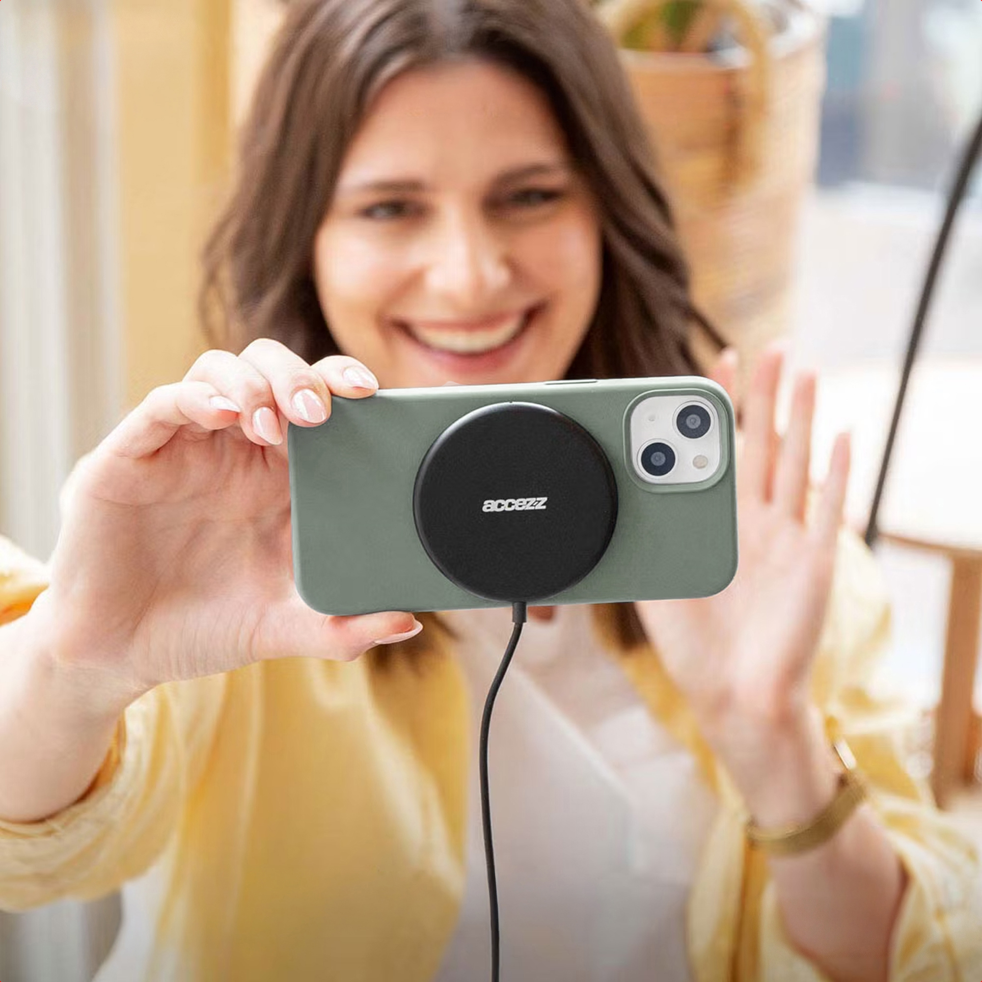 Geef jouw smartphone een strakke én verzorgde look! De Accezz Liquid Silicone Backcover met MagSafe is gemaakt van speciaal gegoten siliconen materiaal en heeft een schokabsorberende werking. Daarnaast voorkomt de microfiber voering krassen op de achterkant jouw toestel. Dankzij de ingebouwde MagSafe functie, maak je gemakkelijk gebruik van MagSafe producten. Zodra het tijd is om jouw telefoon op te laden, kun je het hoesje gewoon om het toestel laten zitten en je MagSafe-oplader op je telefoon klikken. Daarnaast zit het hoesje mooi aangesloten om jouw telefoon. Dankzij het luxe en slanke ontwerp behoudt jouw toestel zijn design. Geschikt voor MagSafe MagSafe is een techniek waarmee accessoires magnetisch aan je telefoon gekoppeld worden. Dit product ondersteunt MagSafe technologie. Dat betekent dat MagSafe producten altijd precies goed op jouw smartphone klikken. Op deze manier maak je op een optimale manier gebruik van een MagSafe draadloze oplader en klikt een MagSafe kaarthouder altijd op de perfecte plek op je telefoon. Ook kun je gebruik maken van een MagSafe powerbank of MagSafe telefoonhouder. Stijlvol design De Accezz Liquid Silicone Backcover met MagSafe is vervaardigd van stevig siliconen materiaal en heeft een schokabsorberende werking. Daarnaast voorkomt de microfiber voering krassen op jouw toestel. Dit hoesje klik je gemakkelijk vast en zit mooi aangesloten om jouw telefoon. Dankzij het luxe en slanke ontwerp behoudt jouw toestel zijn slanke vormgeving. Op maat gemaakt voor je smartphone Het hoesje is op maat gemaakt voor jouw smartphone en sluit naadloos aan op het toestel. In de hoes zijn alle uitsparingen en knoppen verwerkt. Zo zijn de poorten volledig toegankelijk en zijn alle knoppen eenvoudig te bedienen. Waarom de Accezz Liquid Silicone Backcover met MagSafe? * Vervaardigd van stevig siliconen materiaal * Heeft een schokabsorberende werking * Ondersteunt MagSafe technologie * Ontworpen met een matte, zachte coating * De microfiber voering voorkomt krassen op de achterkant van het toestel * Voor een strakke, verzorgde look * Inclusief 1 jaar garantie Een strakke look voor jouw smartphone en gemakkelijk gebruik maken van MagSafe? Bestel dan de Accezz Silicone Backcover MagSafe! Tip: Voor een optimale bescherming van jouw smartphone combineer je deze backcover met de Selencia Gehard Glas screenprotector.