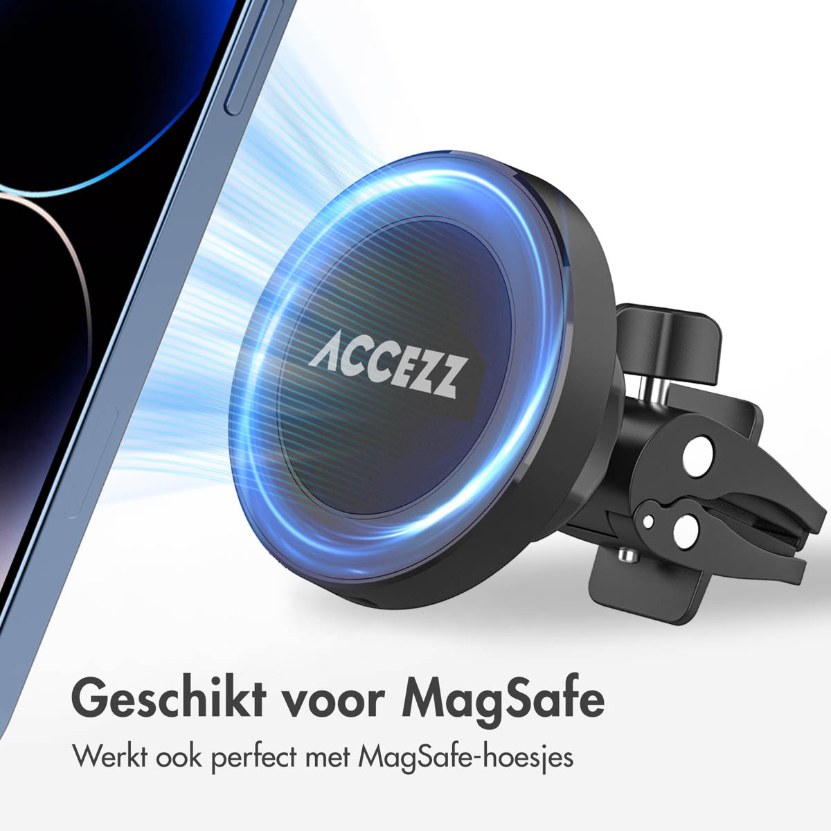 Met deze handige autolader van Accezz voor in het ventilatierooster laad je jouw smartphone gemakkelijk draadloos op tijdens het rijden. De lader ondersteunt de MagSafe technologie, waardoor je jouw iPhone 12 of nieuwere variant eenvoudig op de lader bevestigt. Tevens is de houder compatibel met MagSafe hoesjes, je hoeft je hoesje dus niet van je smartphone te halen. Bevat je toestel geen MagSafe technologie? Geen zorgen! Er wordt een magnetische cirkel meegeleverd zodat elke telefoon op deze houder past. De houder is makkelijk te bevestigen en er wordt een car charger met oplaadkabel meegeleverd. De houder laadt jouw smartphone razendsnel op doordat het beschikt over 15W snelladen. MagSafe mechanisme De houder ondersteunt MagSafe technologie, zodat je jouw iPhone 12 of een nieuwere versie altijd kunt opladen. Ondersteunt jouw smartphone geen MagSafe? Geen zorgen, er wordt een magnetische cirkel bijgeleverd zodat elke smartphone op deze houder past. Dit zorgt ervoor dat je je smartphone optimaal kunt opladen tijdens het rijden. De houder is ook te gebruiken als normale houder zonder dat je je smartphone oplaadt. Er wordt een car charger voor in de sigarettenaansteker van je auto meegeleverd en een oplaadkabel. De car charger doe je in je auto en het kabeltje aan de charger. Zo kun je gelijk opladen! Sterke magneet en veilig onderweg De magneet in de houder is zeer sterk en hierdoor ben je veilig onderweg. Zelfs bij hobbels en bobbels hoef jij je geen zorgen te maken dat je smartphone van de houder valt en voor gevaarlijke situaties zorgt. De houder is 360 graden draaibaar en zo kun je je toestel in de gewenste stand draaien waardoor je ook nog veilig kunt rijden. Eenvoudig te plaatsen De houder is gemakkelijk te plaatsen in het ventilatierooster van je auto. Zo blijft je telefoon in het zicht, maar kun je je ogen gewoon op de weg houden. Er is geen gereedschap nodig bij het plaatsen, je klemt de houder in het ventilatierooster en daarna kun je hem vastdraaien. Waarom de MagSafe draadloze oplader telefoonhouder van Accezz? * Beschikt over MagSafe technologie voor optimaal draadloos opladen met 15W snelladen * Een magnetische cirkel wordt meegeleverd voor toestellen die MagSafe niet ondersteunen * De houder is 360 graden draaibaar voor de perfecte kijkhoek * Car charger en oplaadkabel worden meegeleverd * De sterke magneet zorgt ervoor dat je smartphone niet valt bij hobbels en bobbels * Zonder gereedschap makkelijk te bevestigen in het ventilatierooster * Inclusief 1 jaar garantie Op zoek naar een houder waarmee je moeiteloos gebruik maakt van MagSafe opladen? Ga dan voor deze MagSafe draadloze oplader telefoonhouder van Accezz!