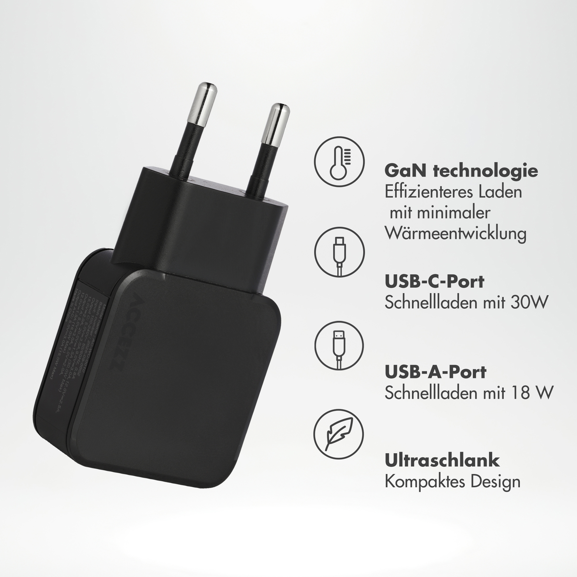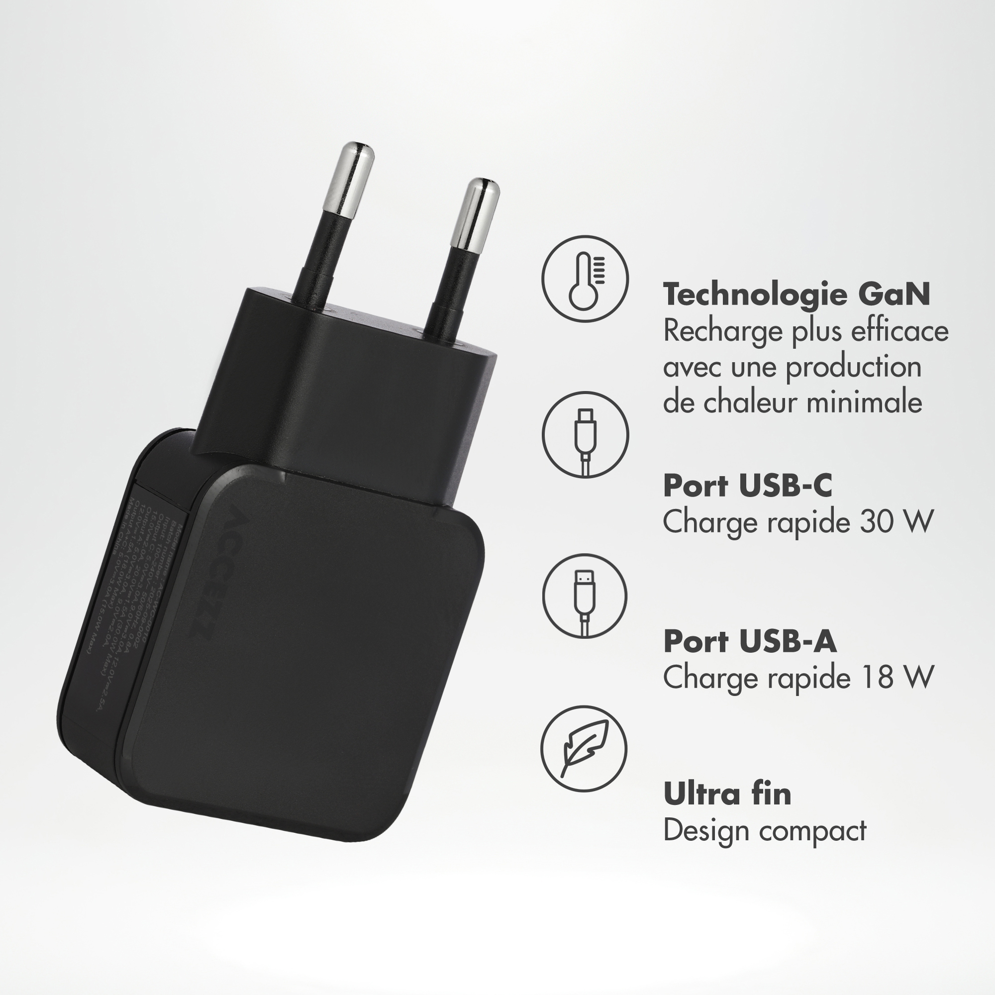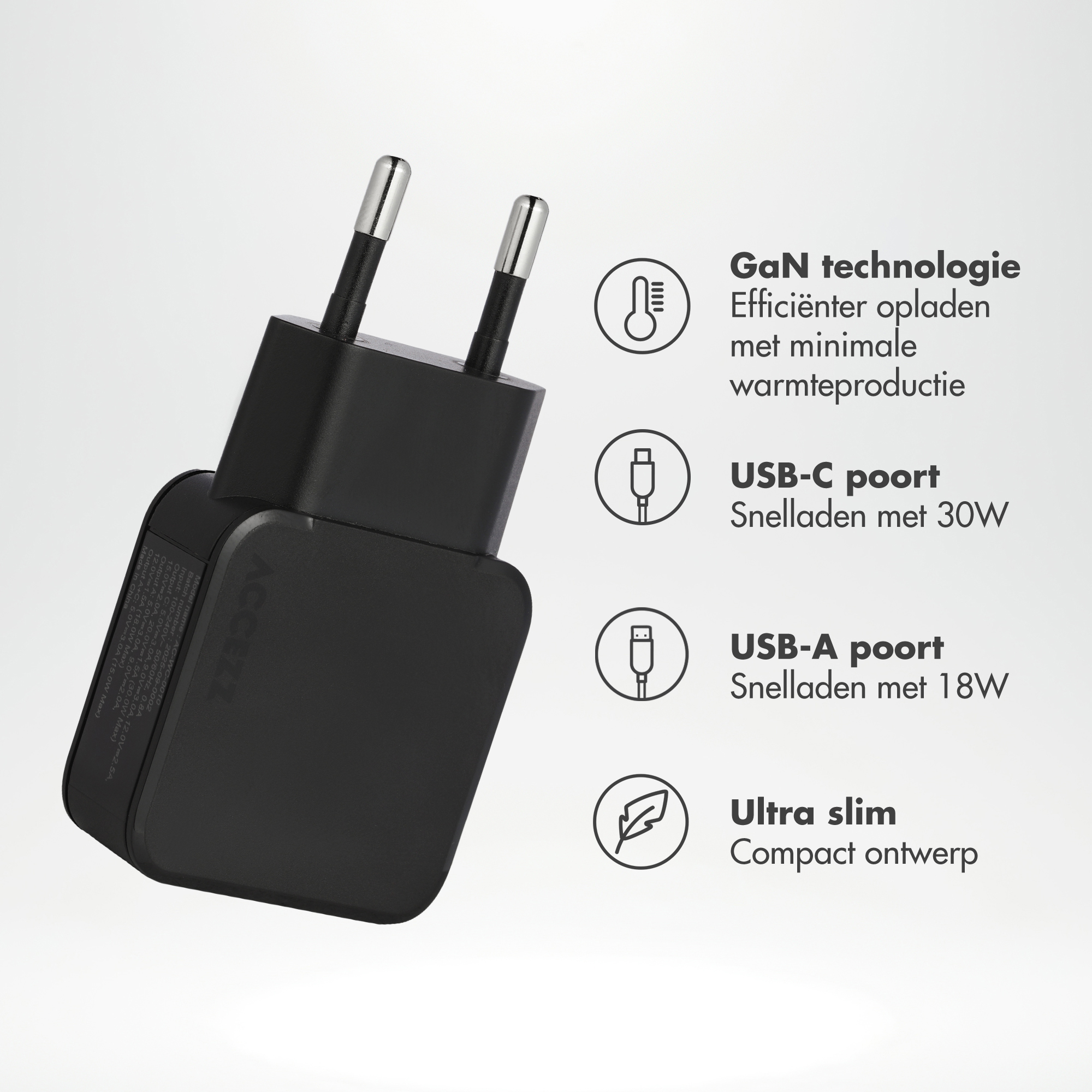 Accezz Ultra Slim GaN Oplader – USB-C + USB-A – 30W – Zwart